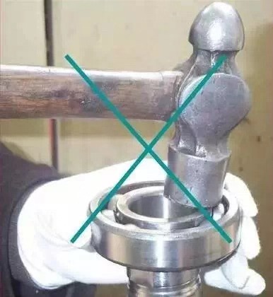 安裝內(nèi)圈(或外圈)過(guò)盈配合的軸承,禁止用鐵錘直接敲擊軸承內(nèi)圈(或外圈)端面,這樣很容易把擋邊敲壞。應(yīng)該采用套筒放在內(nèi)圈(或外圈)端面上,用鐵錘敲擊套筒來(lái)安裝。